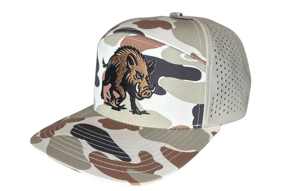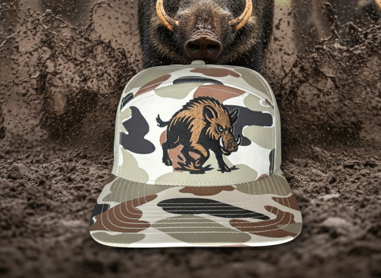Muddy Hog Charge captures the raw aggression of a wild hog breaking loose — dirt flying, earth shaking, and nothing in its path to slow it down. This hat is bold, gritty, and unapologetically wild. The rugged camo and embroidered charging hog pay tribute to the untamed land — where instinct takes over and power meets motion.